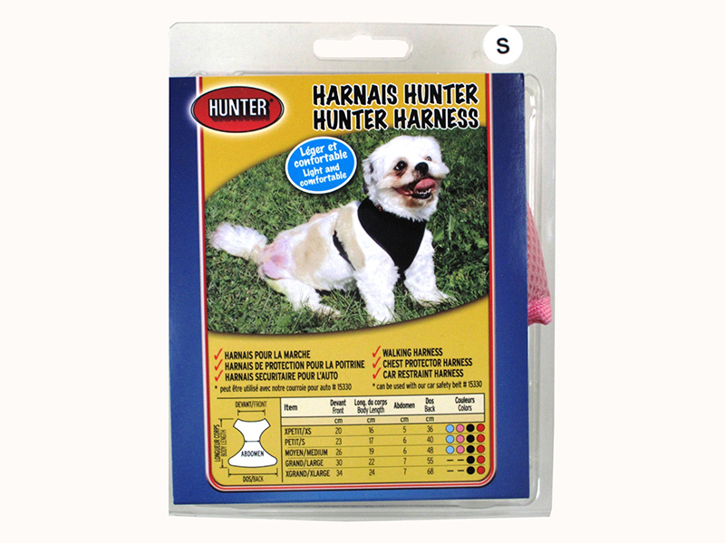 Ce harnais Hunter 3-en-1 est une alternative légère et confortable aux colliers, éliminant la pression autour du cou. Ce protecteur de poitrine en nylon durable doublé peut être porté longtemps. Combiné à une laisse, il est idéal pour l'entraînement des animaux qui tirent en promenade, ou pour les empêcher de se glisser hors de leur collier. En auto, il diminue les risques de blessures, surtout lors des arrêts brusques. De plus, il réduit les distractions en voiture tout en permettant une certaine liberté de mouvement. Pour se servir de ce harnais en voiture, il suffit de passer la ceinture de sécurité du siège arrière sous la courroie sur le dos du harnais, puis boucler.