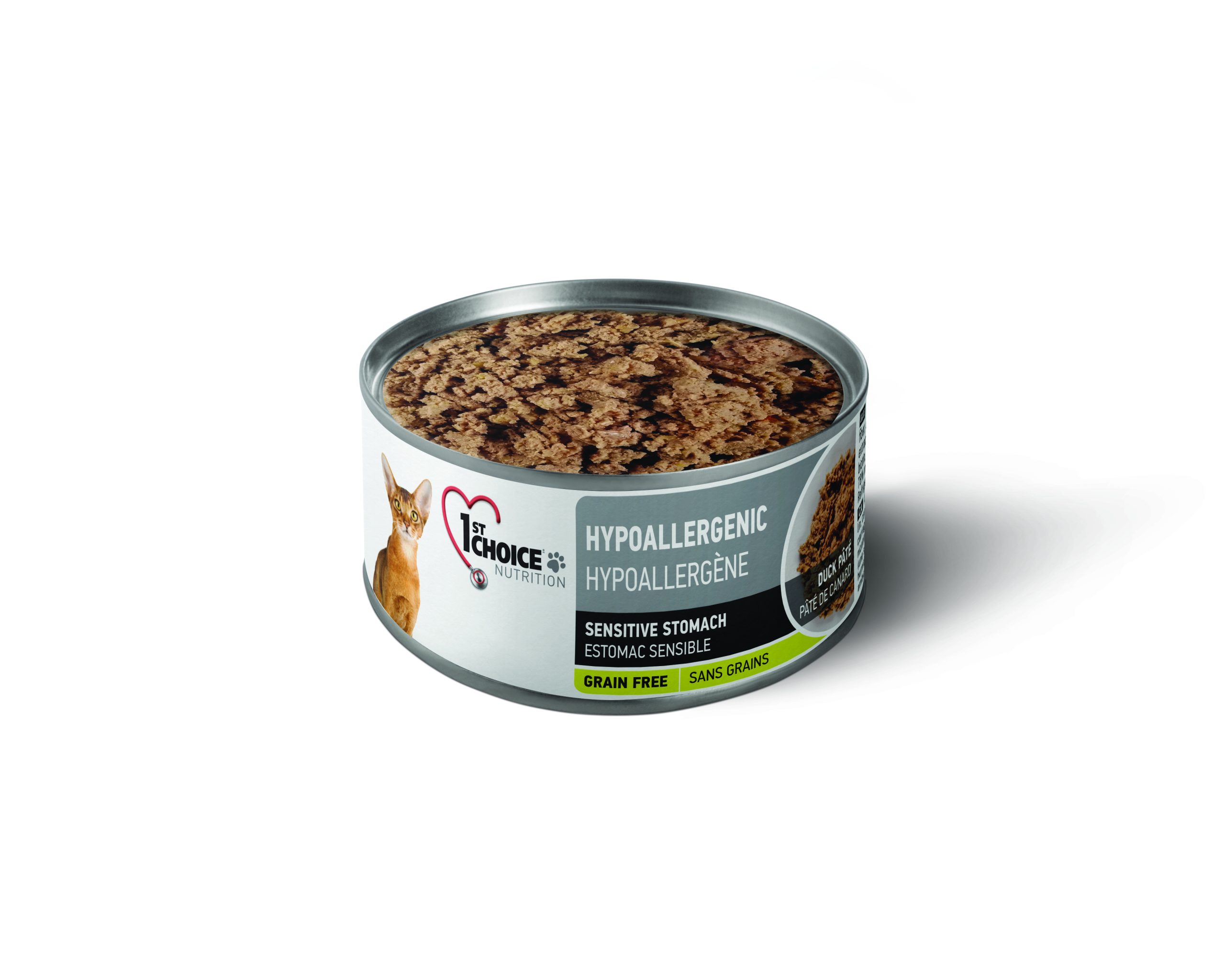 Duck, duck broth, peas, sweet potatoes, flaxseed, calcium carbonate, guar gum, lecithin, pea fiber, choline chloride, salt, DL-methionine, yeast extract, taurine, L-lysine, carrageenan gum, cassia gum, dried chicory root (a source of inulin), ascorbic acid, Vitamin E supplement, yucca schidigera extract, ferrous sulfate, zinc sulfate, nicotinic acid, thiamine mononitrate, Vitamin A supplement, sodium selenite, manganous sulfate, d-calcium pantothenate, pyridoxine hydrochloride, riboflavin, biotin, cholecalciferol (a source of Vitamin D3), Vitamin B12 supplement, calcium iodate, folic acid.