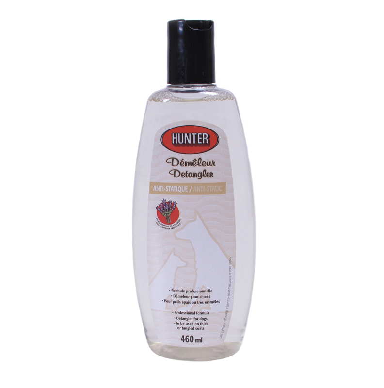 This professional detangler works wonders on thick and heavily matted coats. Lavender scented, its natural ingredients allow manageable hair that is easy to brush. Used before shampooing, it is an excellent cream rinse. Spraying this product lightly on dry fur helps control static electricity. This item is part of a complete line of Hunter shampoos and products specifically developed with pets in mind, cleaning gently and thoroughly. It is suitable for dogs.