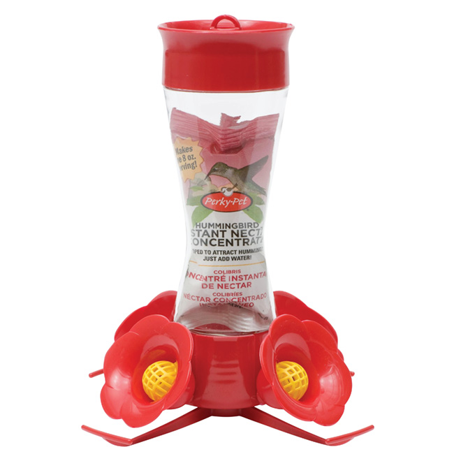 This hummingbird feeder has a large easy-to-fill opening and a base that comes apart for cleaning. An ant moat and bee guards protect the nectar so that only hummingbirds can access it. The feeder has a 8-oz capacity and 4 feeding ports on the base. A 1.3-oz pack of nectar is included.